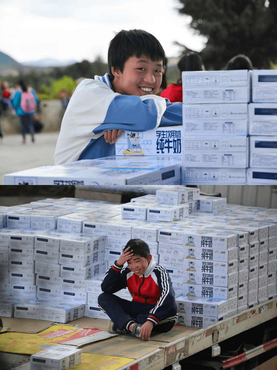 鵲落小學(xué)孩子們搬運(yùn)“伊利營(yíng)養(yǎng)2030”捐贈(zèng)的牛奶物資