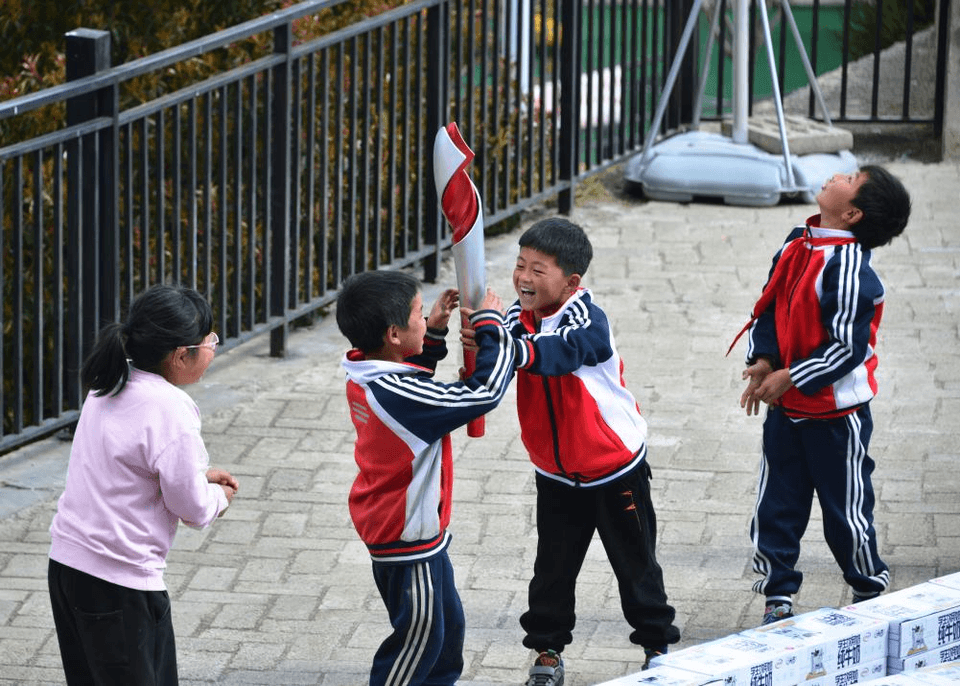 孩子們?cè)趥鬟f“付春來(lái)”叔叔帶來(lái)的冬奧火炬