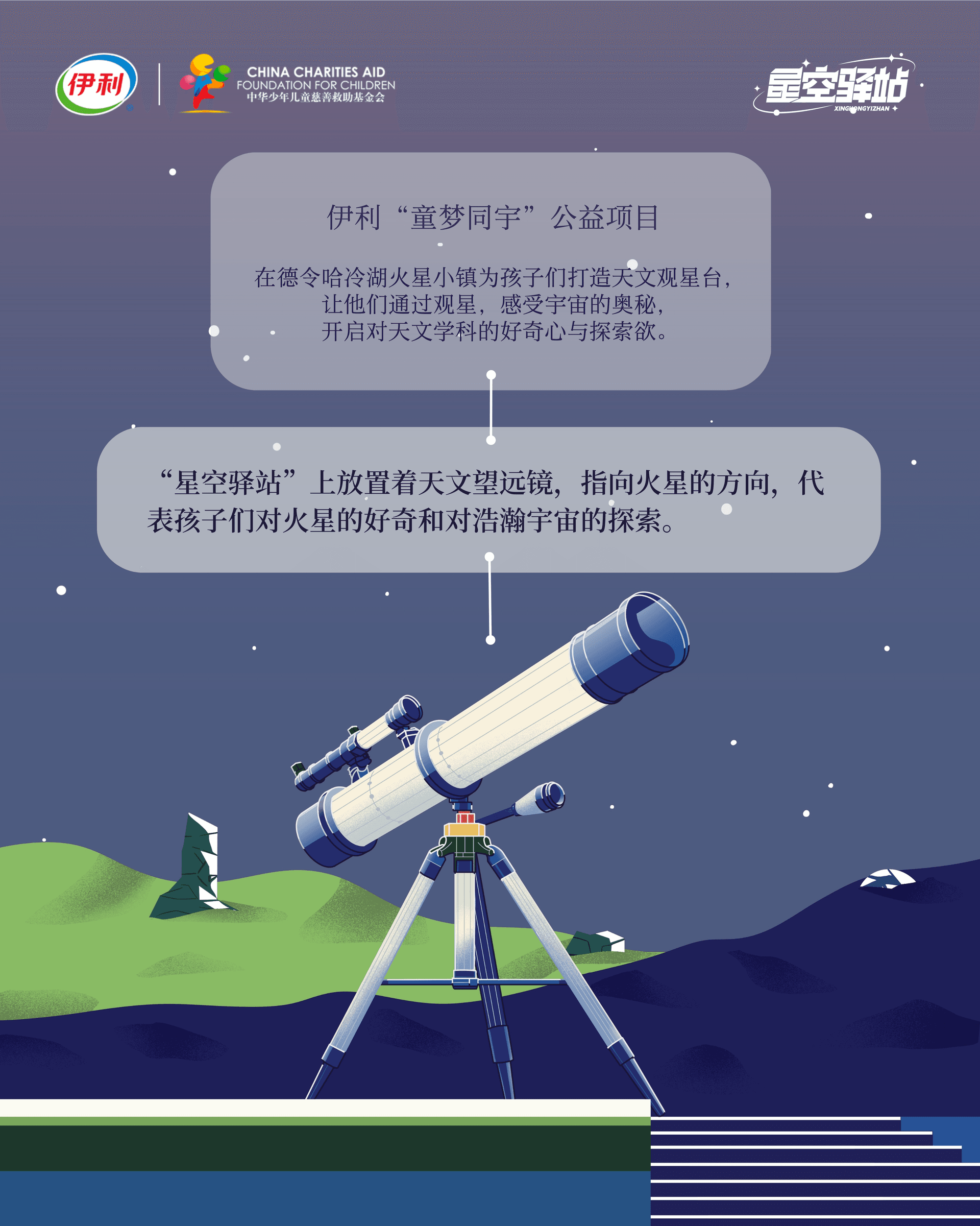 星瀚燦爛,探索無(wú)垠。今年4月24日是第八個(gè)“中國(guó)航天日”,此次航天日聚焦“格物致知 叩問(wèn)蒼穹”的主題,旨在引導(dǎo)廣大青少年不斷探索宇宙的奧秘。人類對(duì)浩瀚宇宙的探索,離不開天文學(xué)基礎(chǔ)學(xué)科的有力支撐。為增加天文知識(shí)的普及程度,讓更多孩子感受宇宙的奧妙,伊利“童夢(mèng)同宇”公益項(xiàng)目在我國(guó)西北戈壁上的冷湖火星小鎮(zhèn)打造了一座專為青少年群體設(shè)計(jì)的“星空驛站”觀星地標(biāo)裝置。