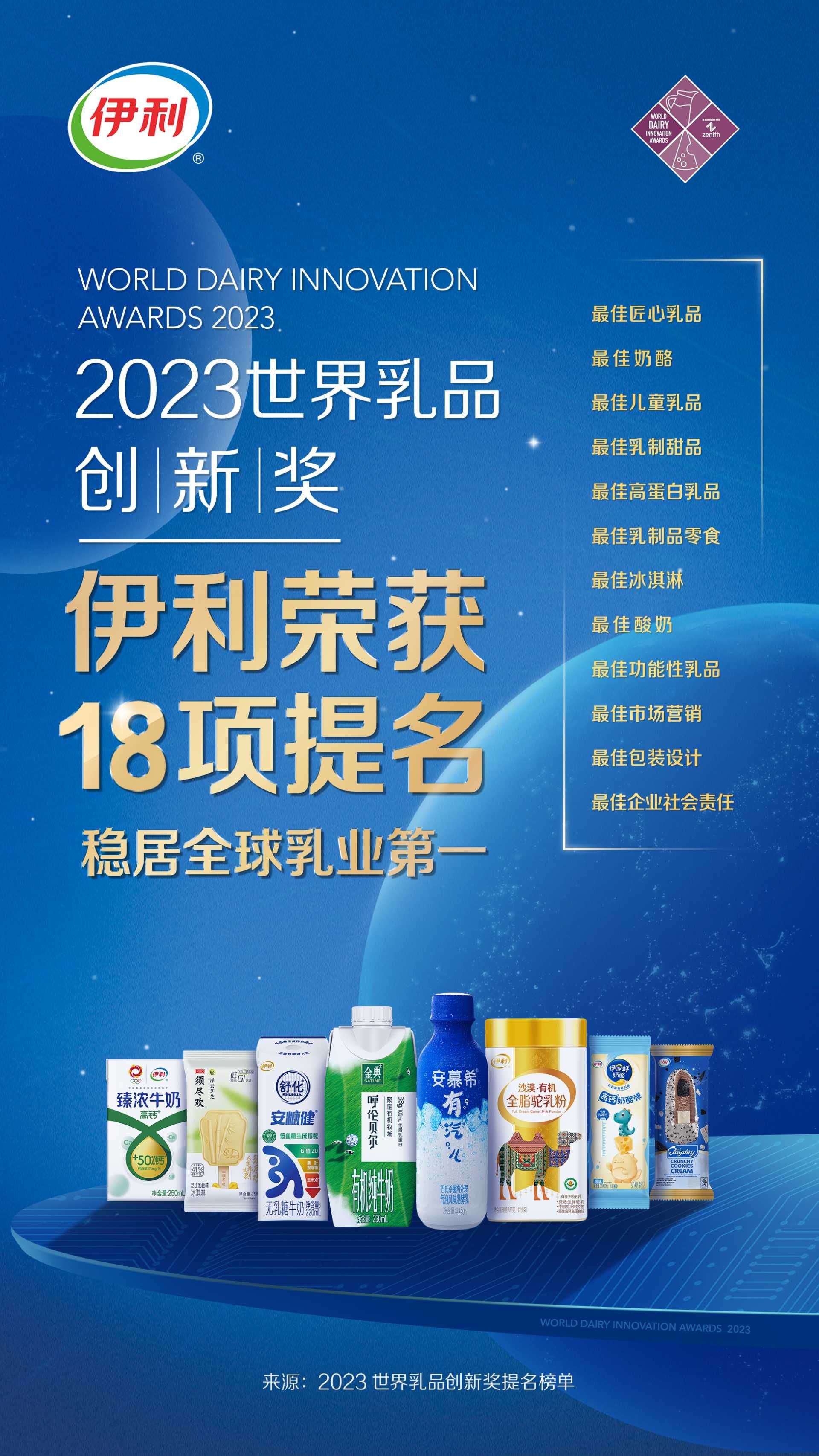 6月8日,2023年世界乳品創(chuàng)新獎(jiǎng)(World Dairy Innovation Awards)最終提名名單面向全球正式發(fā)布。憑借在創(chuàng)新領(lǐng)域的卓越表現(xiàn),伊利榮獲最佳匠心乳品、最佳奶酪、最佳兒童乳品、最佳乳制甜品、最佳高蛋白乳品、最佳乳制品零食、最佳冰淇淋、最佳酸奶、最佳功能性乳品、最佳市場(chǎng)營(yíng)銷、最佳包裝設(shè)計(jì)和最佳企業(yè)社會(huì)責(zé)任/可持續(xù)發(fā)展倡議12個(gè)類別獎(jiǎng)項(xiàng)的18項(xiàng)提名,獲提名數(shù)量持續(xù)提升,再創(chuàng)歷史新高,成為全球獲提名最多的乳制品企業(yè),標(biāo)志著伊利創(chuàng)新實(shí)力獲得全球行業(yè)高度認(rèn)可。