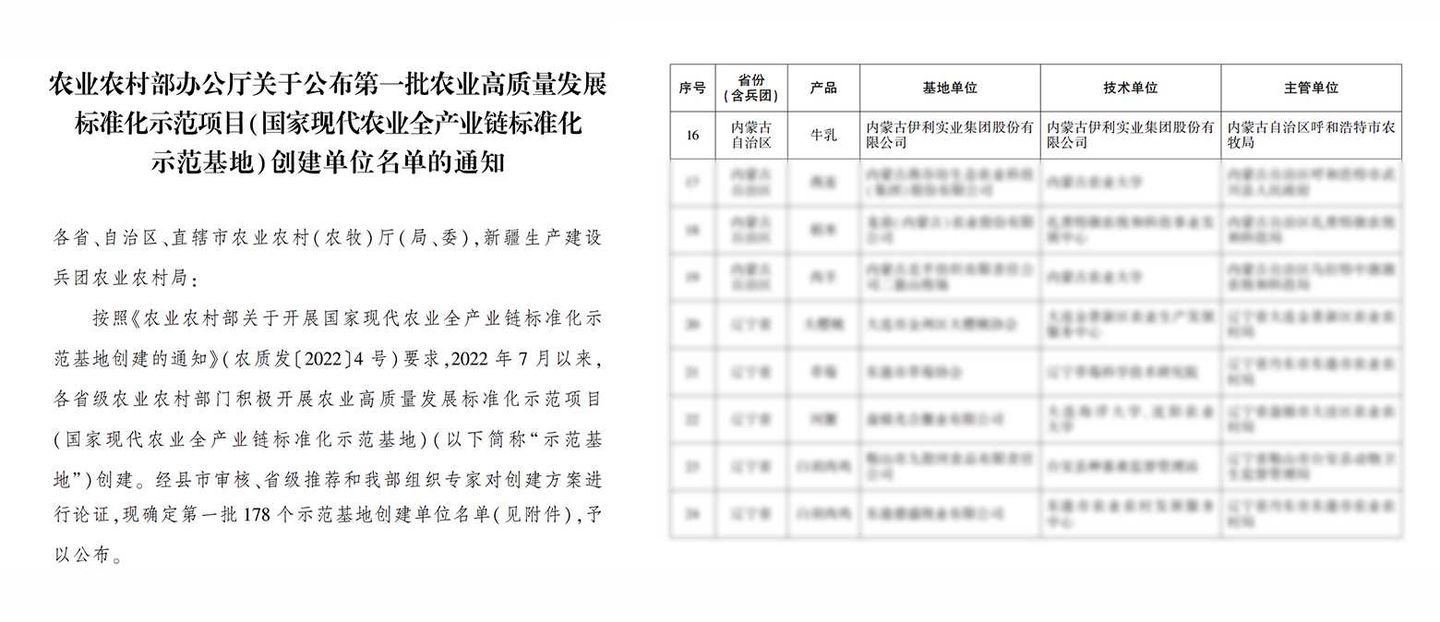 近日,農(nóng)業(yè)農(nóng)村部公布了國家現(xiàn)代農(nóng)業(yè)全產(chǎn)業(yè)鏈標準化示范基地創(chuàng)建單位名單,伊利憑借領(lǐng)先的全產(chǎn)業(yè)鏈標準化建設(shè)以及示范引領(lǐng)作用,成為首批創(chuàng)建單位。多年來,中國乳業(yè)龍頭伊利在高質(zhì)量發(fā)展之路持續(xù)探索,先后入選工業(yè)與信息化部遴選的“互聯(lián)網(wǎng)與工業(yè)融合創(chuàng)新試點企業(yè)”、文化和旅游部評定的“國家旅游科技示范園區(qū)”、商務部評定的“全國供應鏈創(chuàng)新與應用示范企業(yè)”等多個國家級項目,為中國式現(xiàn)代化貢獻力量。