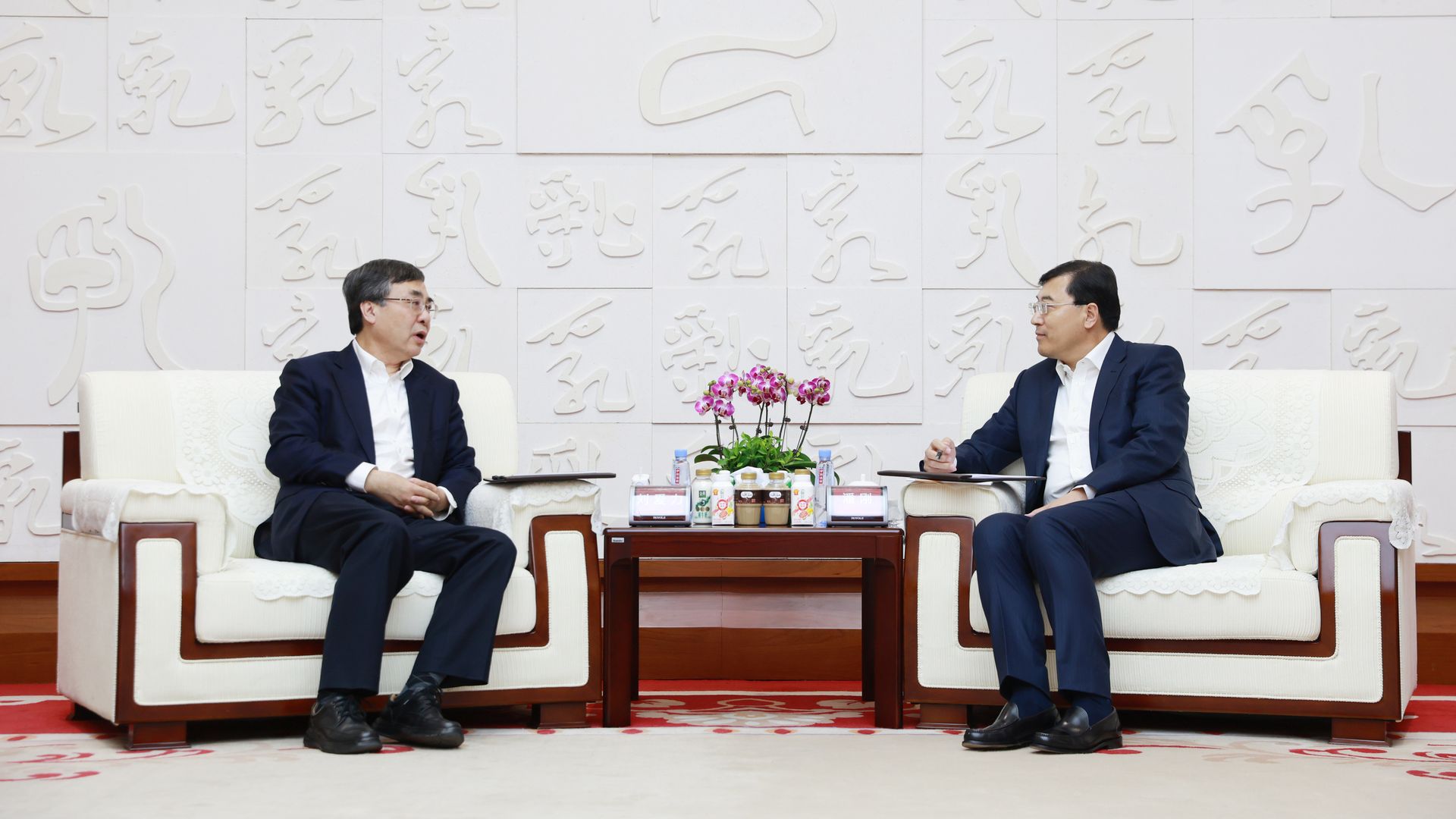 伊利集團(tuán)董事長(zhǎng)、總裁潘剛(右)與中國(guó)郵政集團(tuán)董事長(zhǎng)、黨組書記劉愛(ài)力(左)座談