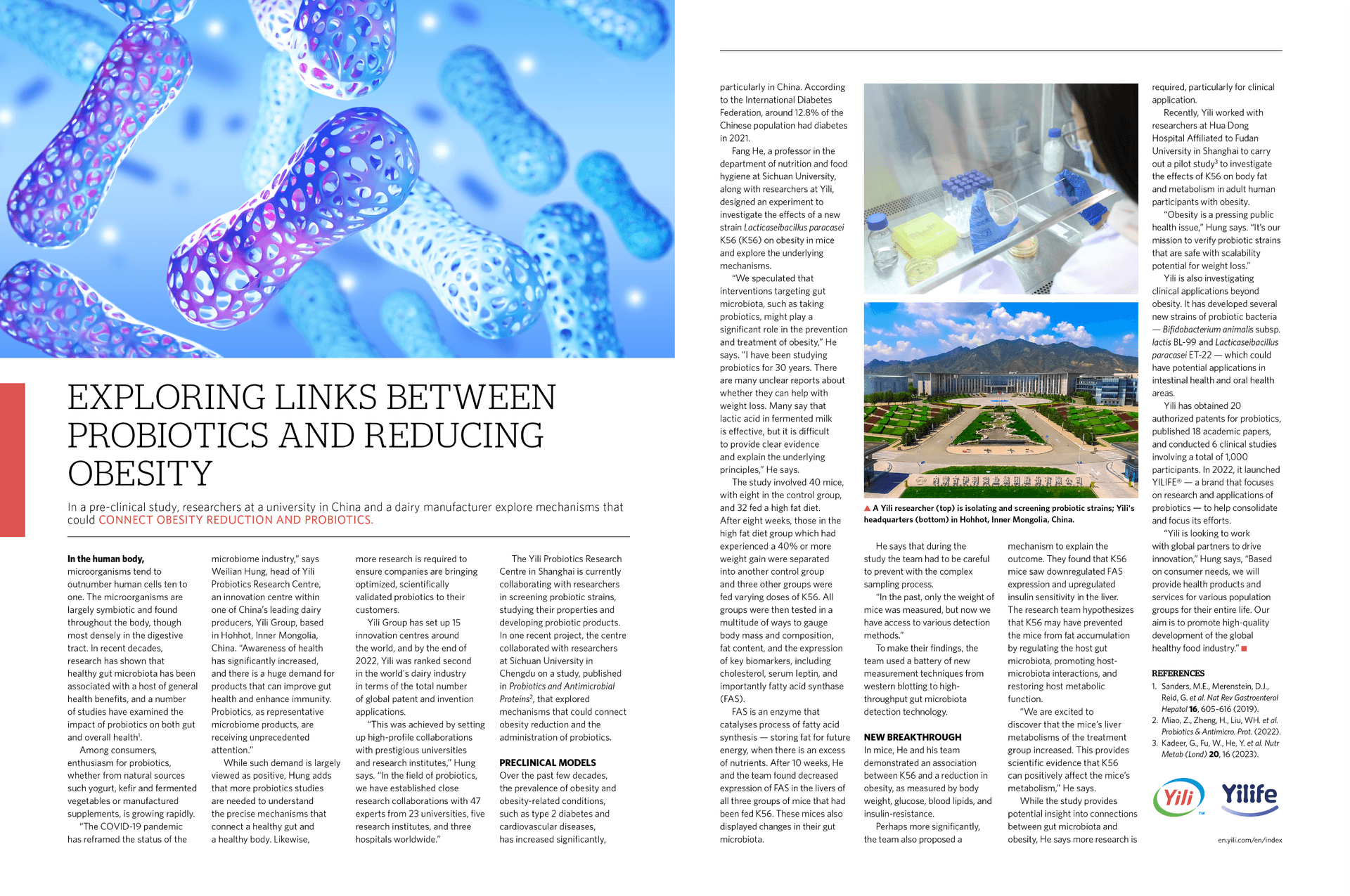 6月15日,全球?qū)W術(shù)界享有盛譽(yù)的國(guó)際綜合性科學(xué)雜志《Nature》推出中國(guó)營(yíng)養(yǎng)研究專(zhuān)刊(Spotlight: Nutrition research in China),發(fā)布了一篇題為《益生菌與緩解肥胖的關(guān)系探索》的專(zhuān)題報(bào)道,對(duì)伊利集團(tuán)構(gòu)建全球創(chuàng)新體系,深耕基礎(chǔ)研究領(lǐng)域,探索益生菌創(chuàng)新研發(fā)并獲得自主知識(shí)產(chǎn)權(quán)進(jìn)行了深入的報(bào)道,標(biāo)志著伊利自主創(chuàng)新成果獲得全球行業(yè)高度關(guān)注與認(rèn)可。