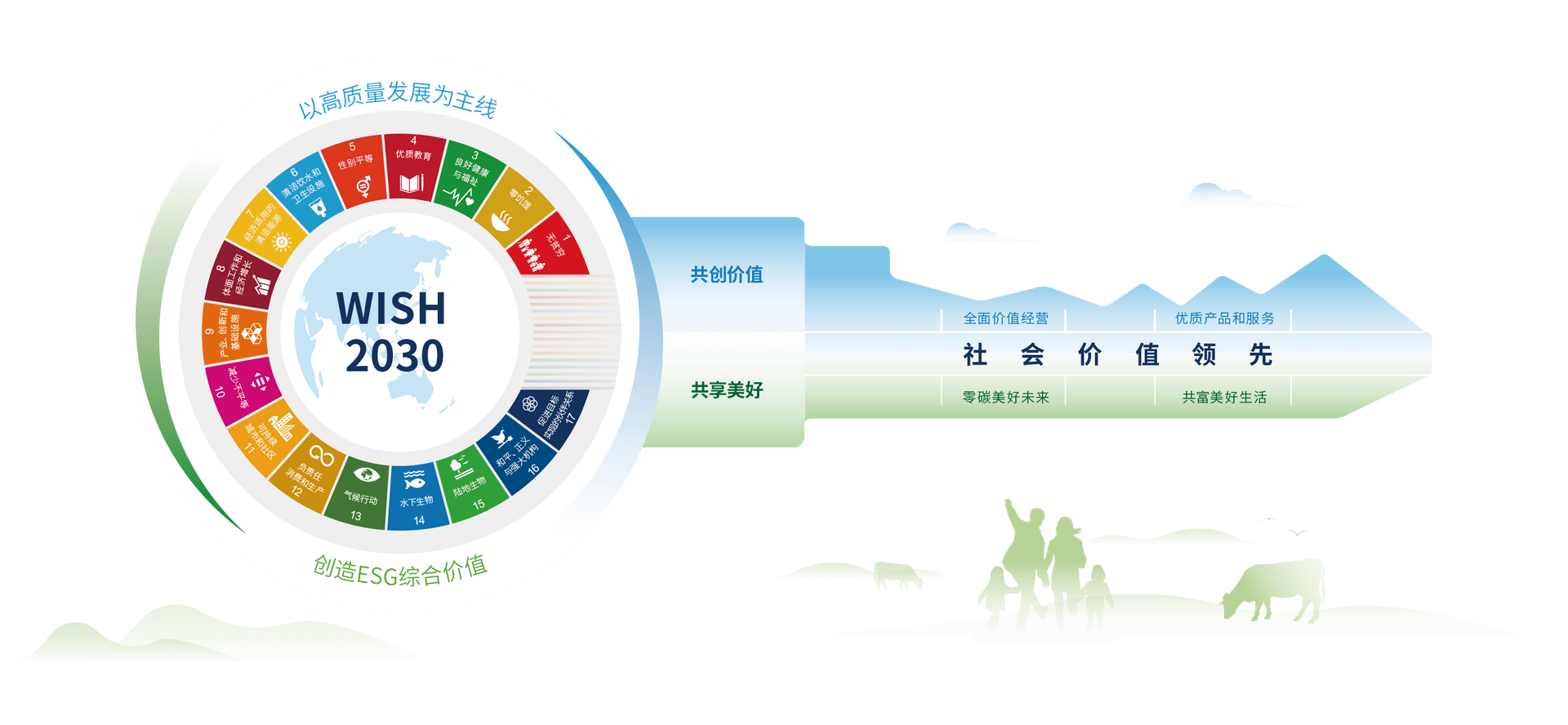 “始于綠色,興于共贏,歸于美好”是伊利的可持續(xù)發(fā)展之道。作為一家食品企業(yè),伊利不僅關(guān)注于為全球消費(fèi)者提供值得信賴的健康食品,也致力于為地球的美好未來貢獻(xiàn)力量。 可持續(xù)發(fā)展是破解當(dāng)前全球性問題的“金鑰匙”,2022年伊利將“WISH”體系升級(jí)為“WISH 2030”金鑰匙可持續(xù)發(fā)展體系,全面落實(shí)聯(lián)合國(guó)2030可持續(xù)發(fā)展目標(biāo)(SDGs)、聚焦“讓世界共享健康”和“社會(huì)價(jià)值領(lǐng)先”,通過可持續(xù)發(fā)展這把“金鑰匙”實(shí)現(xiàn)“共創(chuàng)價(jià)值、共享美好”。